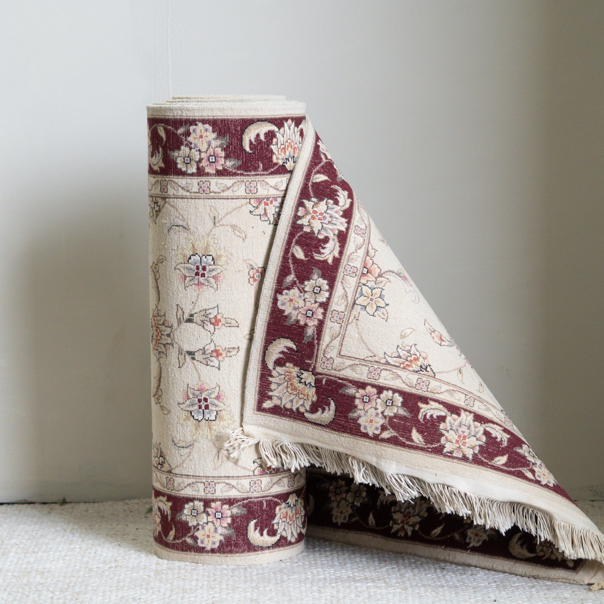 This is an authentic vintage Oriental Persian runner rug with its original tag still attached. I sourced it directly from the family who owned it, and it was only lightly used. Recently, I cleaned it with a Hoover carpet machine—while not perfect, it removed most of the surface dirt, but there may be some darker spots of dirt, best to take to a professional cleaner!