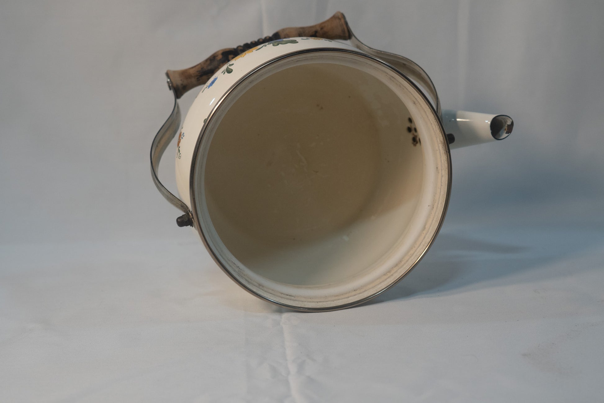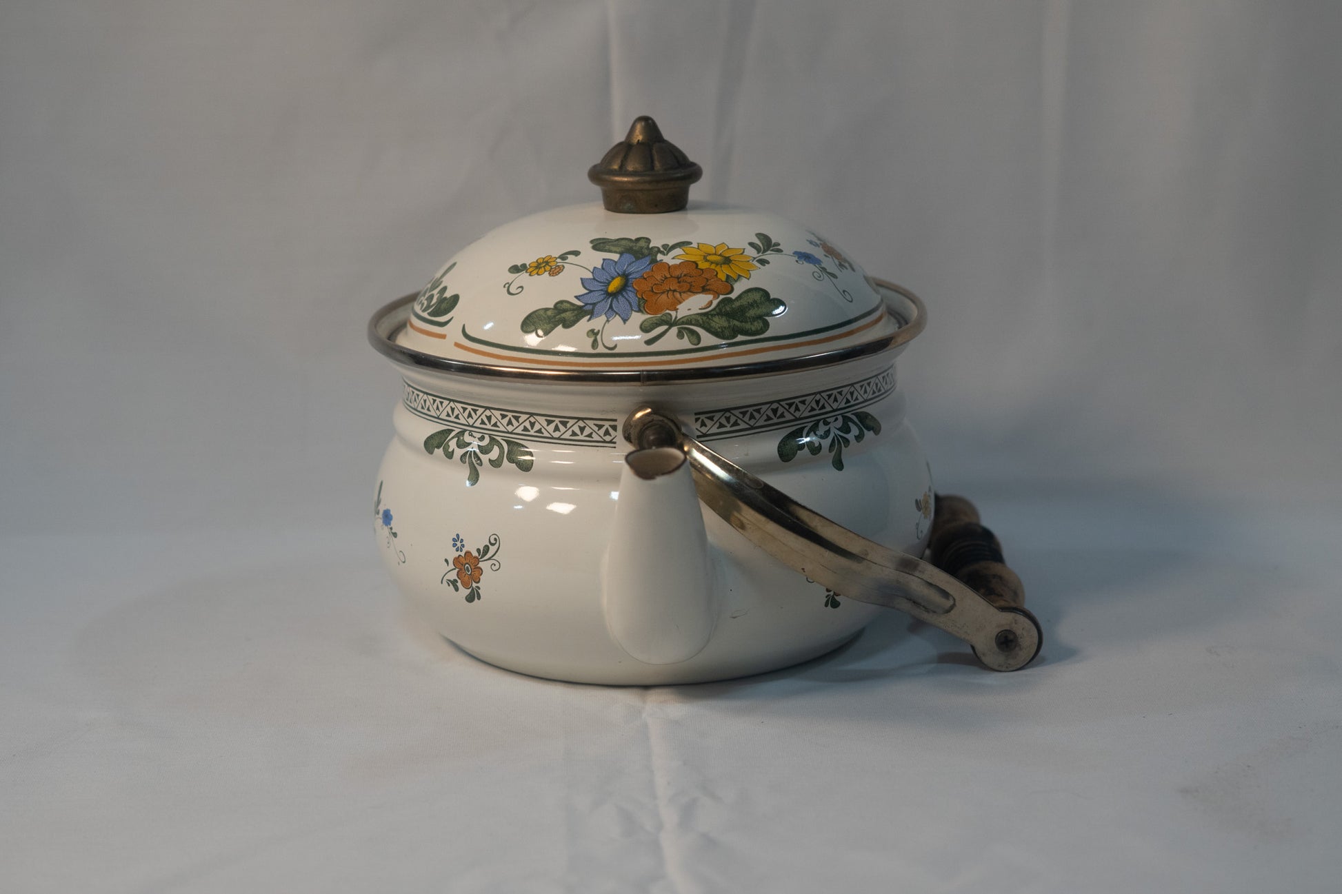 A gorgeous white enamel teapot, with floral detailing, brass hardware, and a carved wood handle. This piece is in great condition for its age, with no scratches on the enamel, and minimal wear on the bottom and spout. This kettle will add so much charm to the daily ritual of a cozy cup of tea. It is on the smaller side, so please read the measurements below carefully.