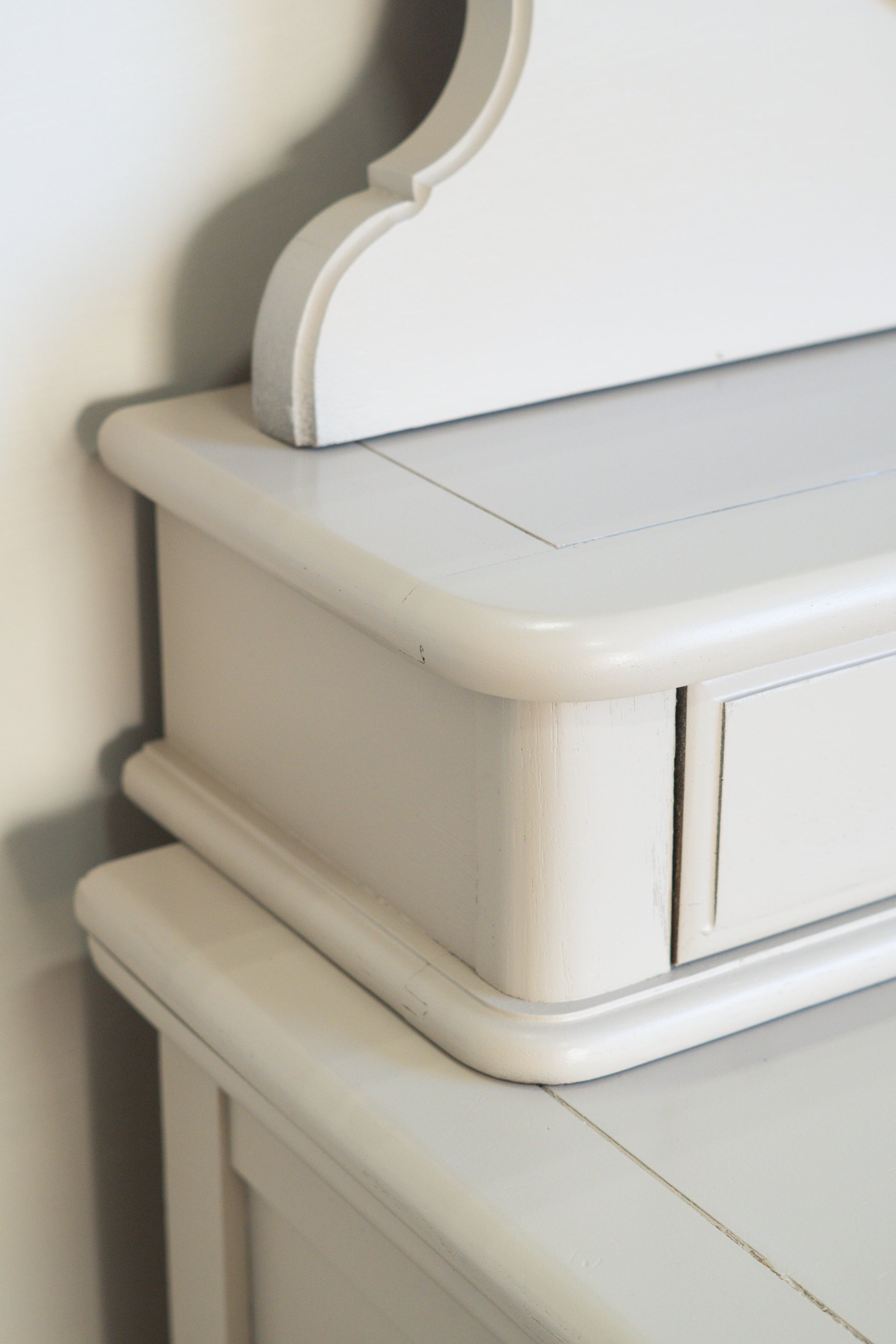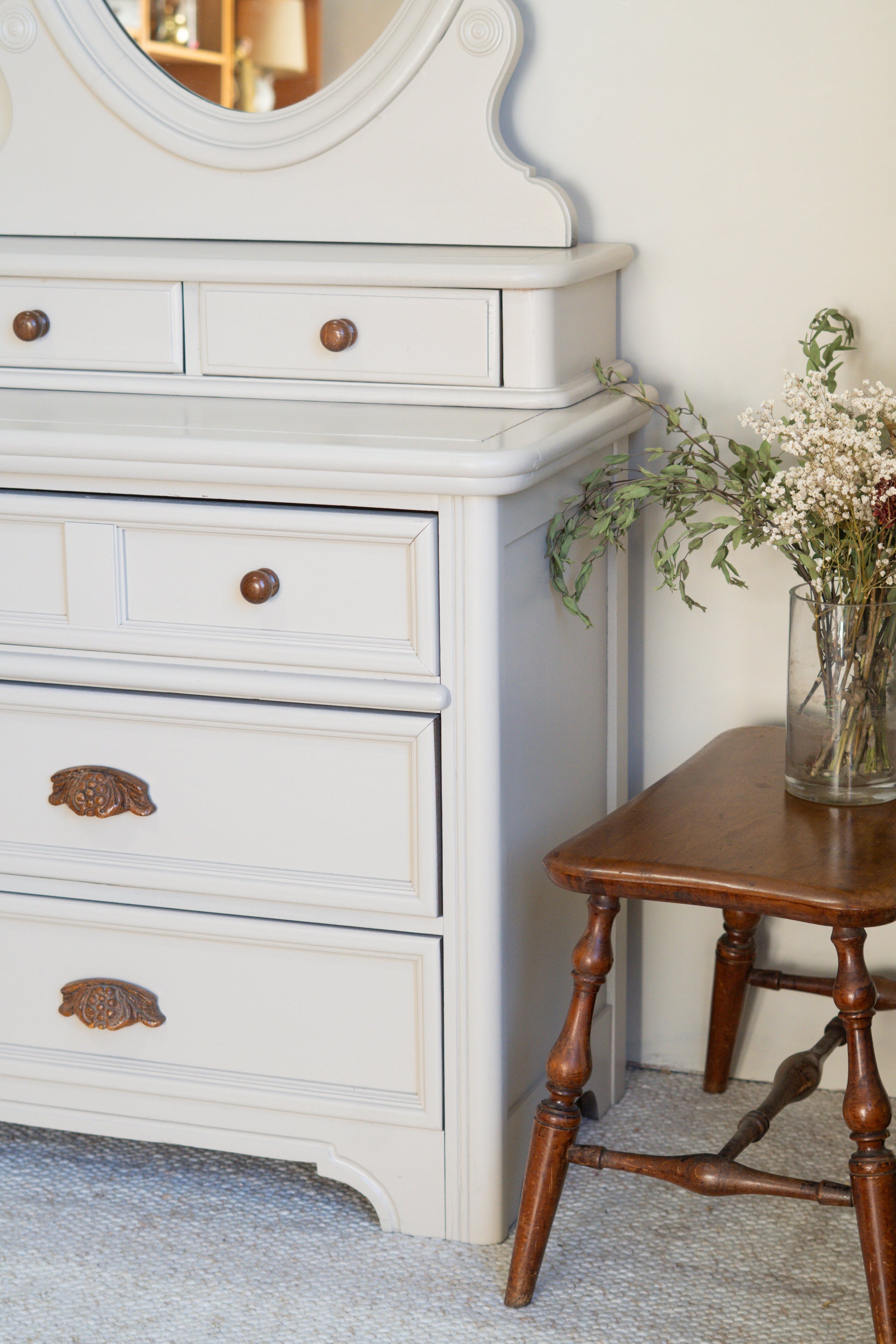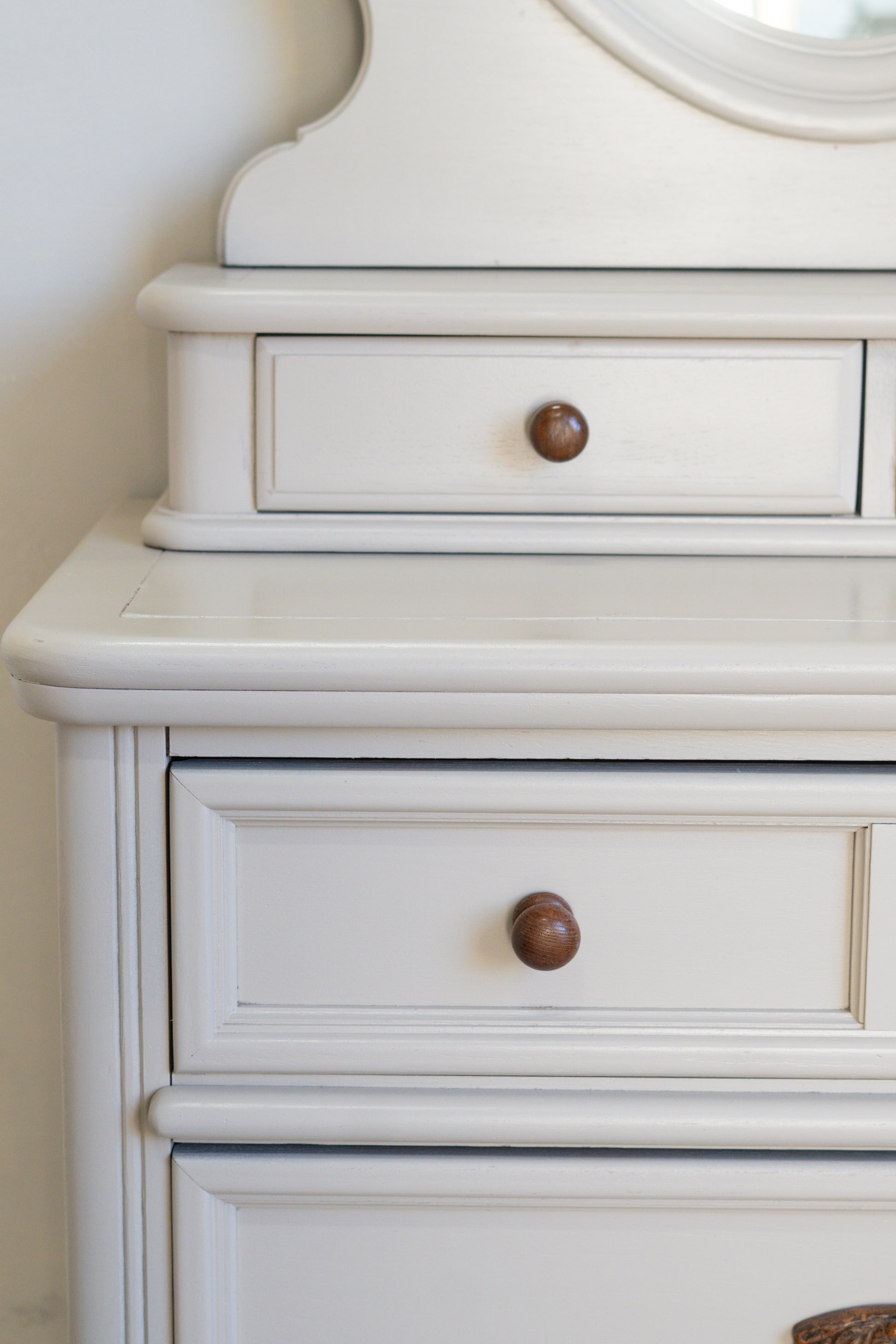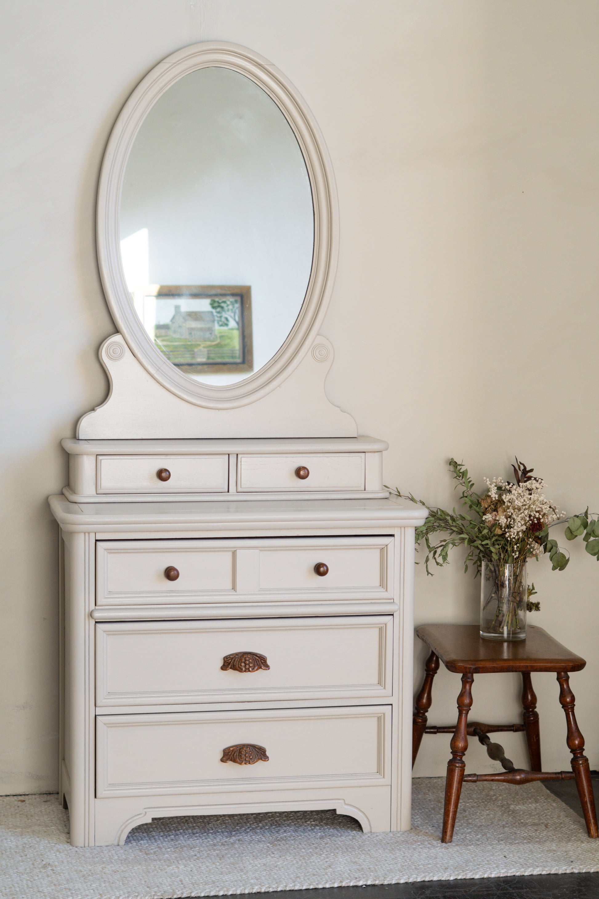 Truly one of a kind Dresser with Oval Mirror! Refinished Dixie dresser in a soft yellow-beige tone. Original handles pair beautifully with wood accents. Drawers slide smoothly and include fresh contact paper. Larger drawers can be used for clothes and smaller drawers on top for makeup. All itmes can detach and they fit in an SUV car. This is perfect for a small space! Pictures have been brightened to showcase all details, the color ca change depending on lighting.