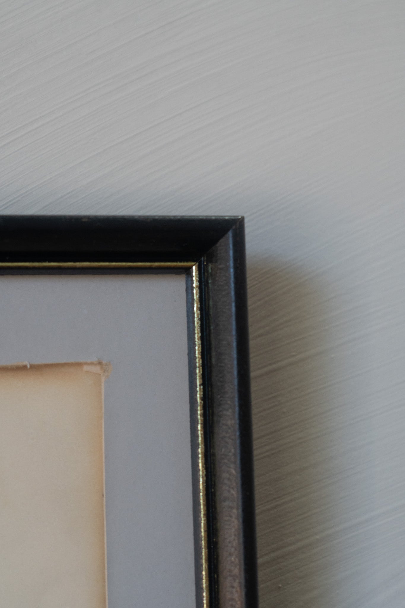 A beautiful sketch of a young girl done in black ink or pencil, in a simple black frame. It is an original work of art with an indiscernible signature, so the artist is unknown. There is some wear on the matting and the paper has yellowed quite a bit due to age, adding to its vintage feel. The girl’s alert eyes and rough strokes of hair make it an eye-catching piece, perfect for any art-lover’s home.