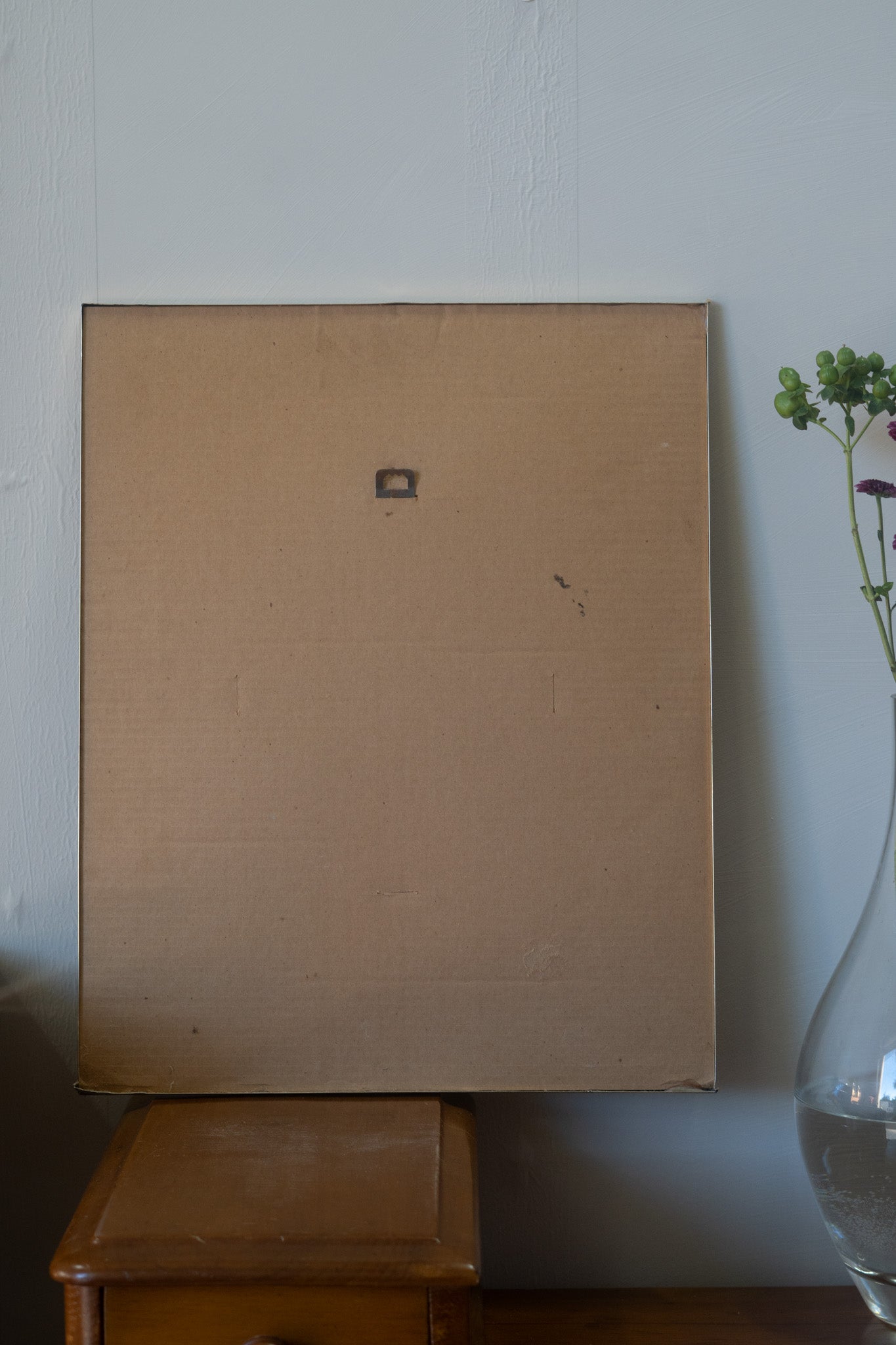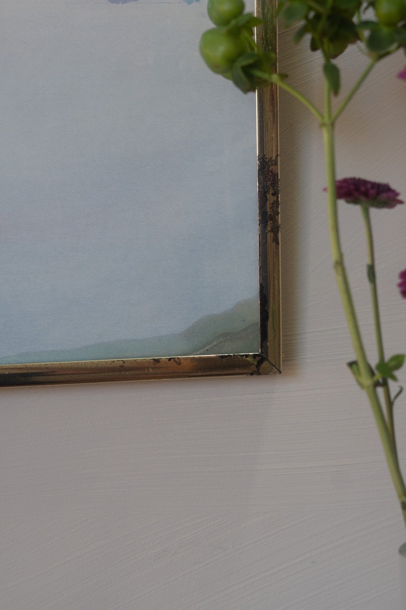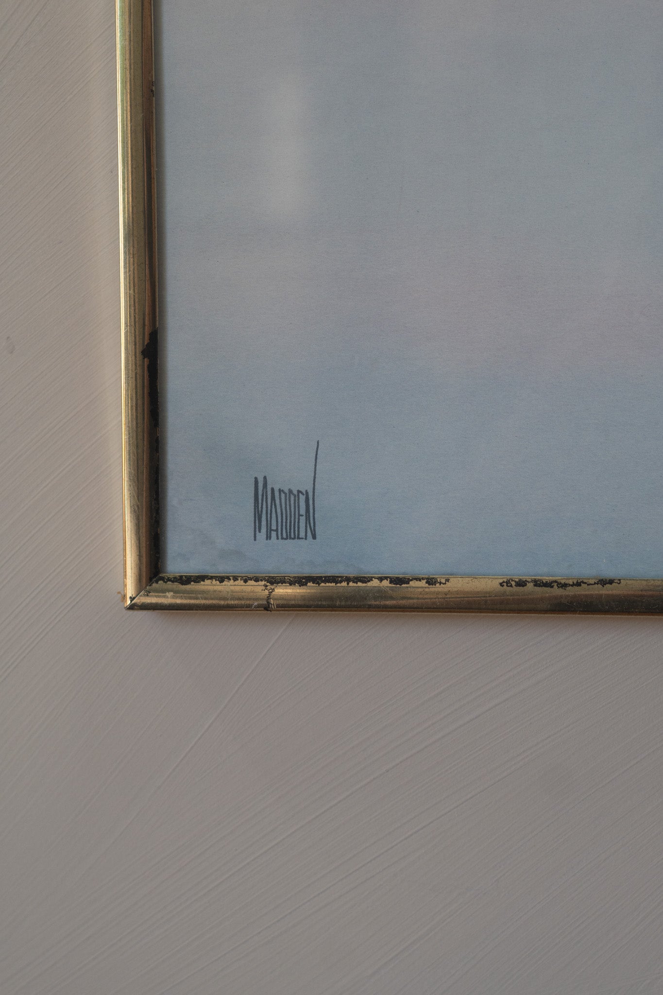 Retro Southwestern watercolor print by renowned artist & teacher Terry Madden. It depicts the beautiful multistoried adobe buildings of Taos Pueblo in New Mexico. The print comes in a simple thin gold frame that compliments the minimal lines and washed hues of the painting itself. There is some minor damage to the frame, but the print is in excellent condition.