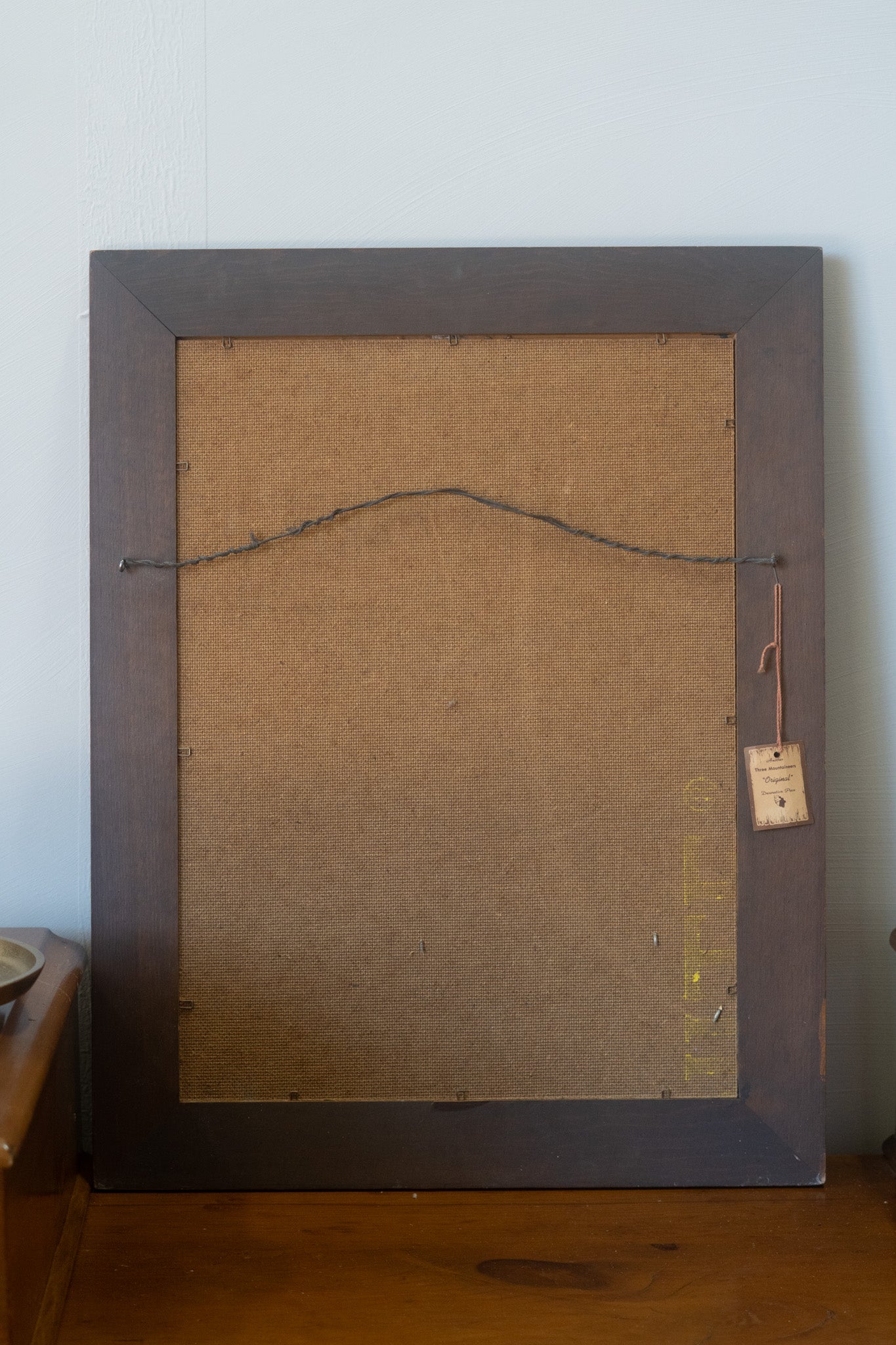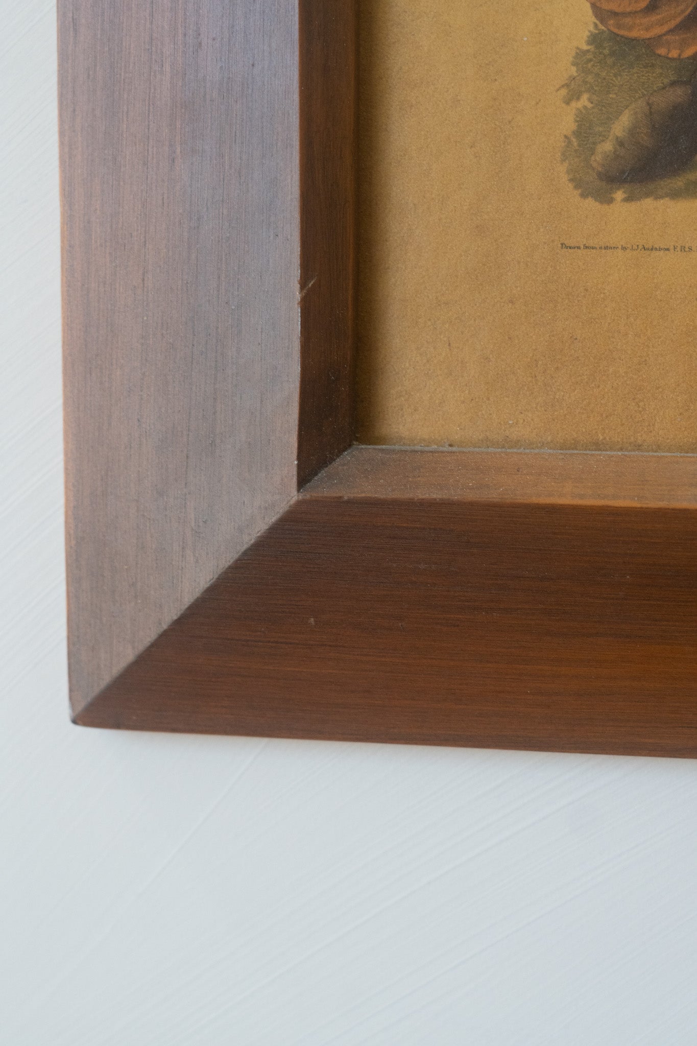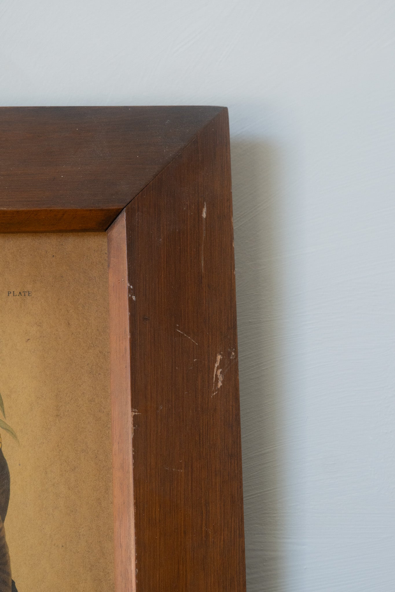 A stunning wild turkey print, in the beloved vintage scientific illustration art style. The original illustration was printed as a color lithograph by famous naturalist J.J. Audubon, namesake of the Audubon society. The wood frame still has a tag attached, from Three Mountaineers, boasting genuine old pine finish. The frame has some scuffs and the print has some yellowing, but this adds to the vintage appeal of the piece.